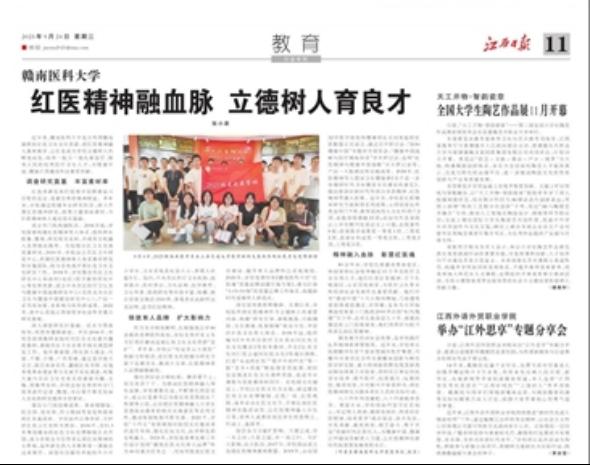9月24日,《江西日报》教育版头条刊发我校党委书记、校长张小康署名文章《红医精神融血脉 立德树人育良才》。