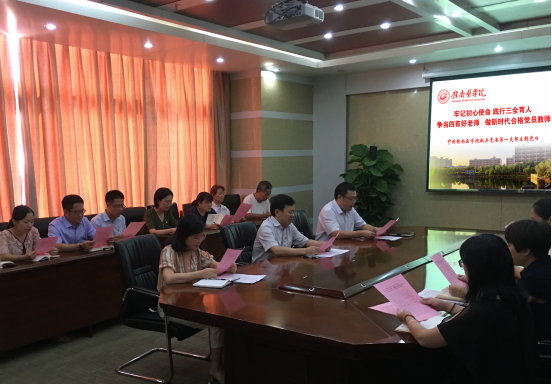 教师是太阳底下最光辉的职业。在即将开展“不忘初心、牢记使命”主题教育和庆祝第35个教师节之际,赣南医学院机关党委第一党支部召开主题党日活动,组织重温入党誓词,诵读新《党章》,学习习近平关于教育的重要论述精神和学校党委暑期处级干部培训班有关精神,全体党员纷纷在《牢记初心使命 践行三全育人 争当“四有”好老师 做新时代合格党员教师》公开承诺书上签字,表示要严格按照习近平总书记“四有”好老师的要求,决心做到以下四点,一是坚定理想信念,做合格党员;二是坚持立德树人,做师德表率;三是提升自身能力,做育人能手;四是满怀仁爱之心,做心灵使者。争做政治素质过硬、业务能力精湛、育人水平高超的高素质教师。